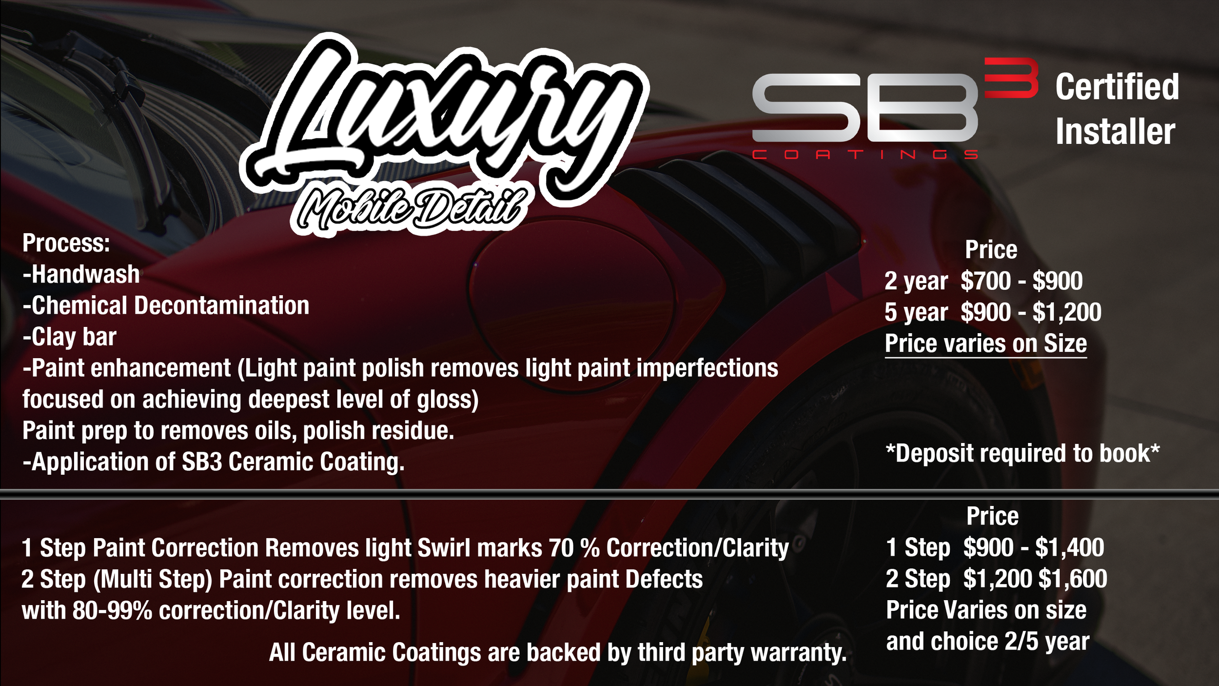 Silica based liquid polymer cures to form a protective layer with hydrophobic properties and can last and upwards of 5 + year with regular maintenance. Coatings helps prevent water stains, road grime, bird droppings and reduce dust buildup while provide a permanent high gloss and ease of cleaning.